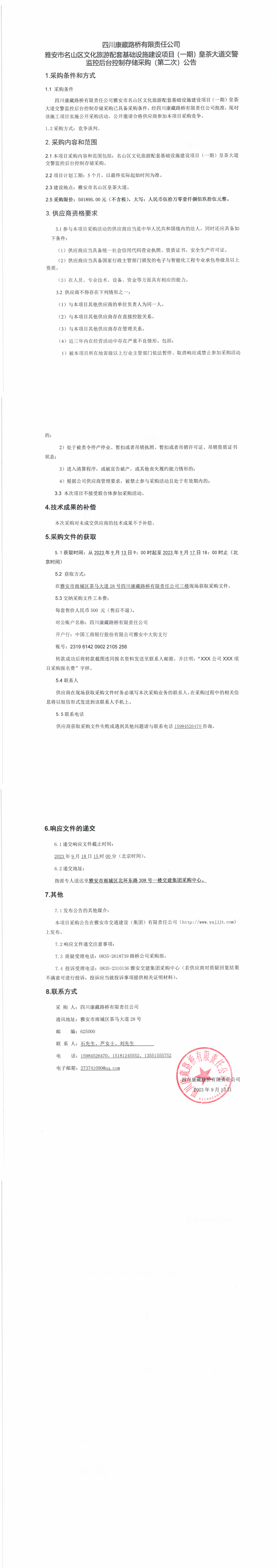 四川康藏路橋有限責(zé)任公司雅安市名山區(qū)文化旅游配套基礎(chǔ)設(shè)施建設(shè)項目(一期)皇茶大道交警監(jiān)控后臺控制存儲采購(第二次)公告
