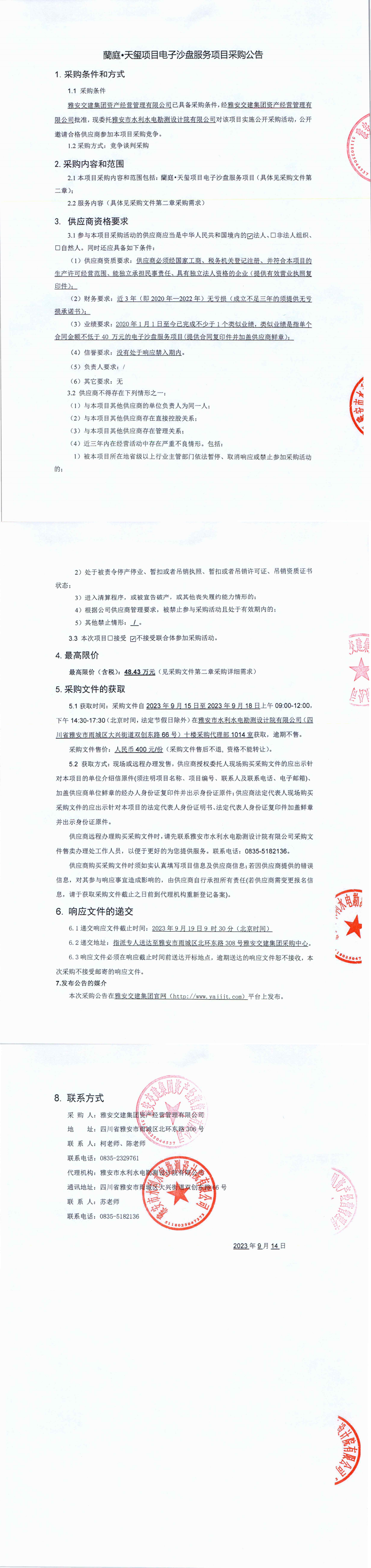 雅安交建集團(tuán)資產(chǎn)經(jīng)營管理有限公司交建蘭庭·天璽項(xiàng)目電子沙盤服務(wù)項(xiàng)目競(jìng)爭(zhēng)談判公告