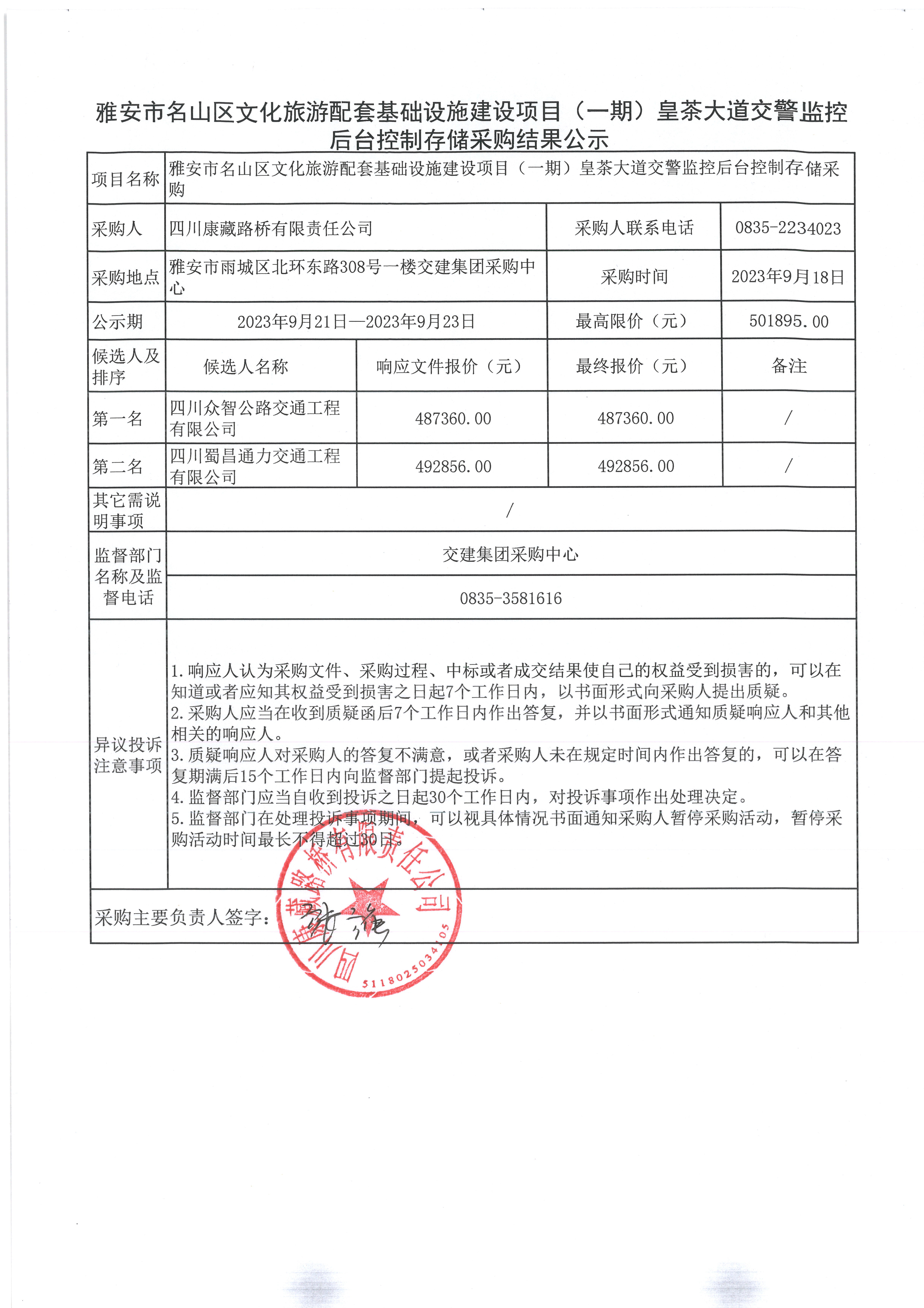四川康藏路橋有限責(zé)任公司雅安市名山區(qū)文化旅游配套基礎(chǔ)設(shè)施建設(shè)項(xiàng)目(一期)皇茶大道交警監(jiān)控后臺控制存儲采購結(jié)果公示