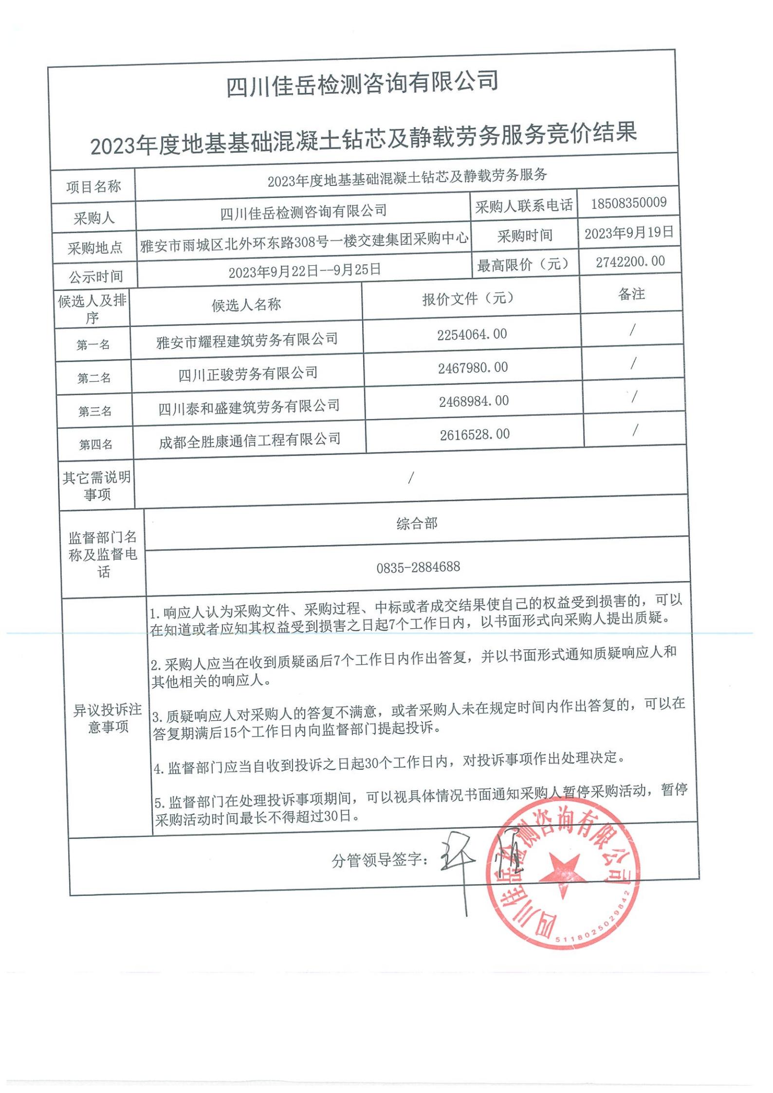 四川佳岳檢測(cè)咨詢(xún)有限公司2023年度地基基礎(chǔ)混凝土鉆芯及靜載勞務(wù)庫(kù)內(nèi)競(jìng)價(jià)結(jié)果