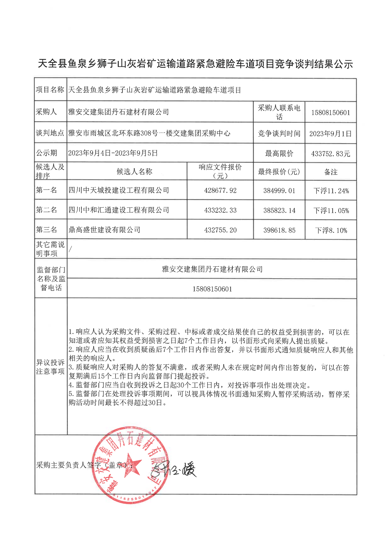 雅安交建集團(tuán)丹石建材有限公司天全縣魚泉鄉(xiāng)獅子山灰?guī)r礦運輸?shù)缆肪o急避險車道項目競爭談判結(jié)果公示