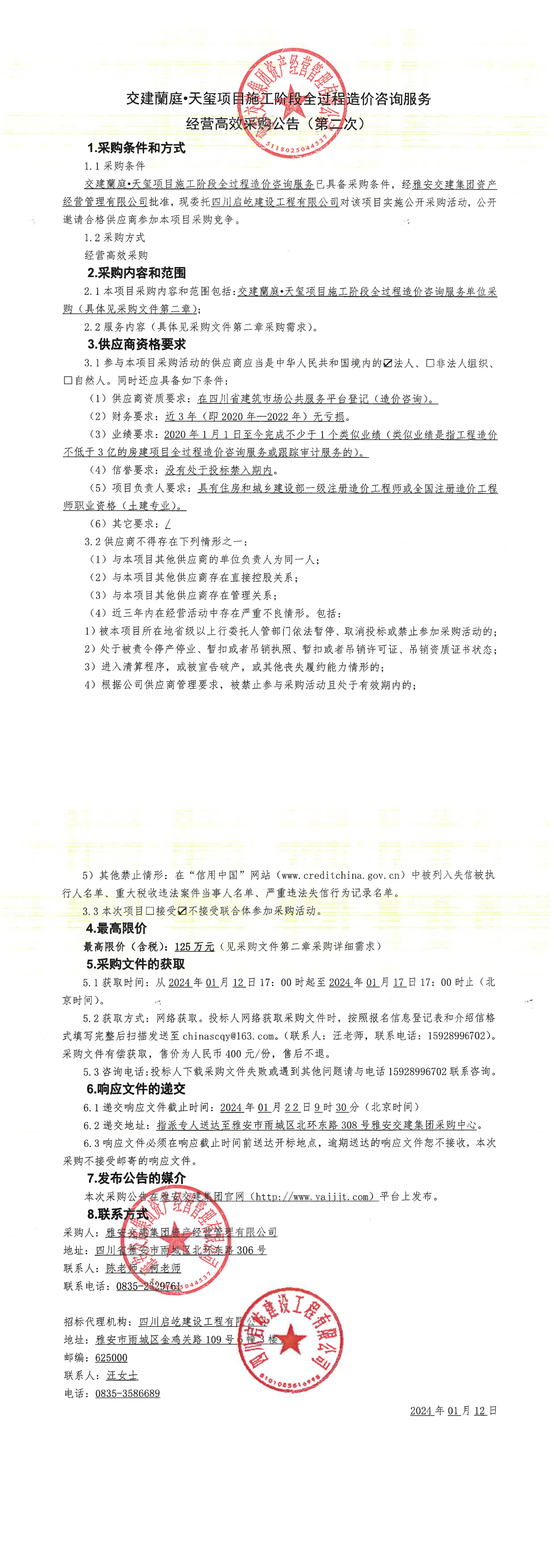 雅安交建集團資產(chǎn)經(jīng)營管理有限公司交建蘭庭·天璽項目施工階段全過程造價咨詢服務經(jīng)營高效采購公告(第二次)