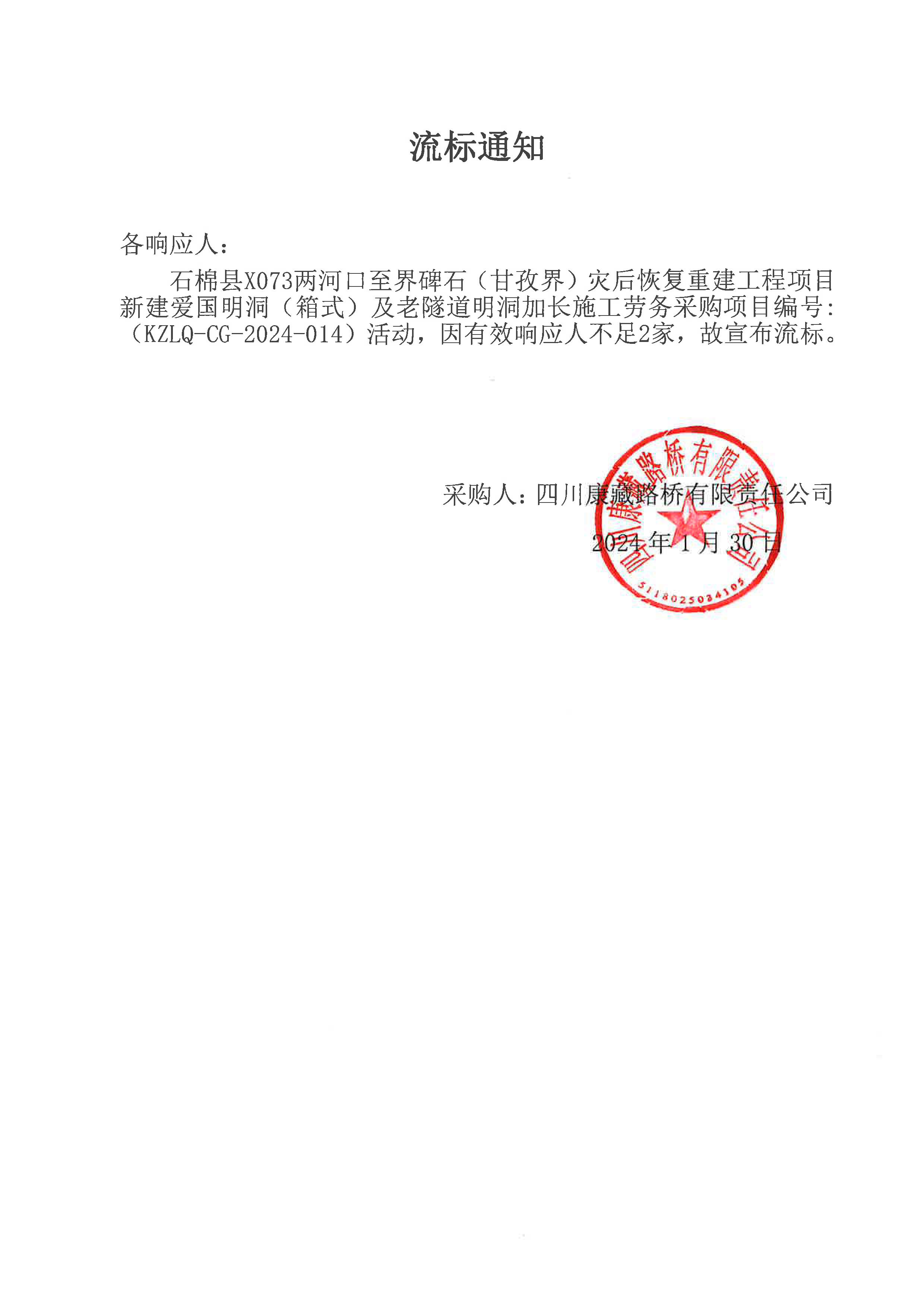 四川康藏路橋有限責(zé)任公司石棉縣X073兩河口至界碑石 (甘孜界)災(zāi)后恢復(fù)重建工程項目新建愛國明洞(箱式)及老隧道明洞加長施工勞務(wù)流標(biāo)通知