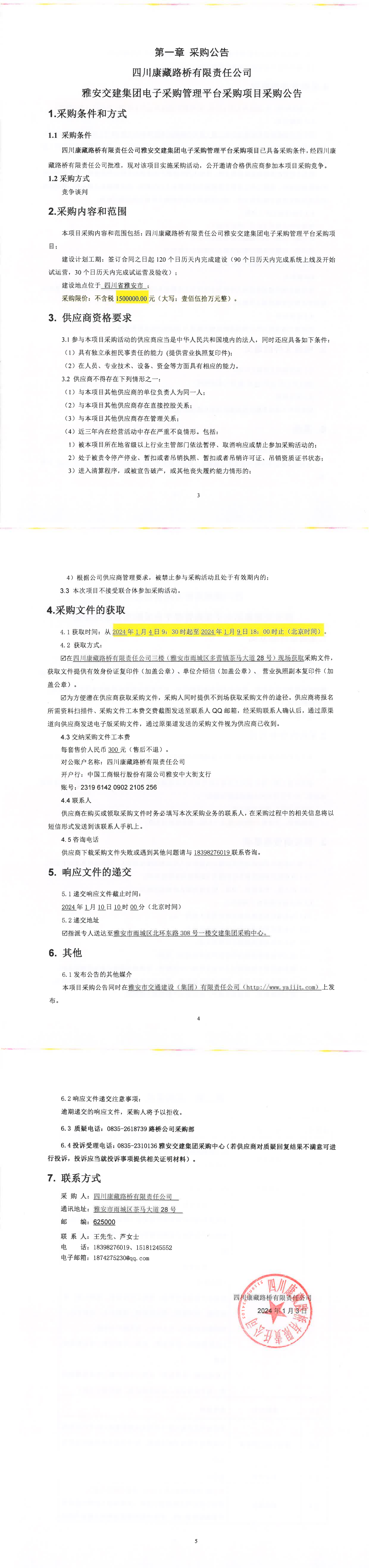 四川康藏路橋有限責(zé)任公司雅安交建集團(tuán)電子采購管理平臺(tái)采購項(xiàng)目采購公告