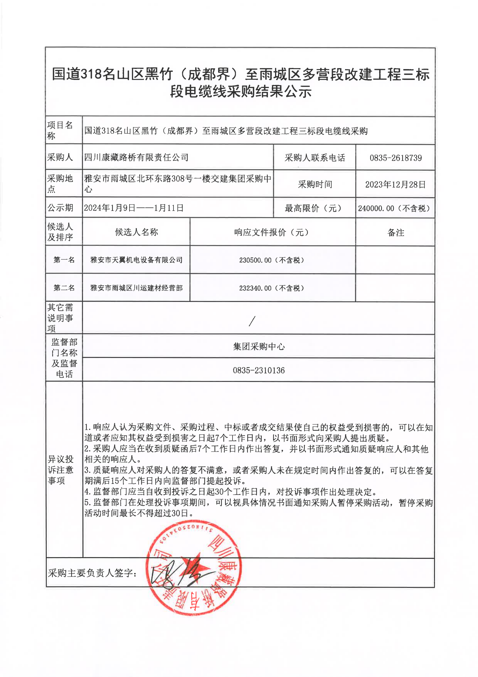 四川康藏路橋有限責(zé)任公司國(guó)道318名山區(qū)黑竹(成都界)至雨城區(qū)多營(yíng)段改建工程三標(biāo)段電纜線采購結(jié)果公示