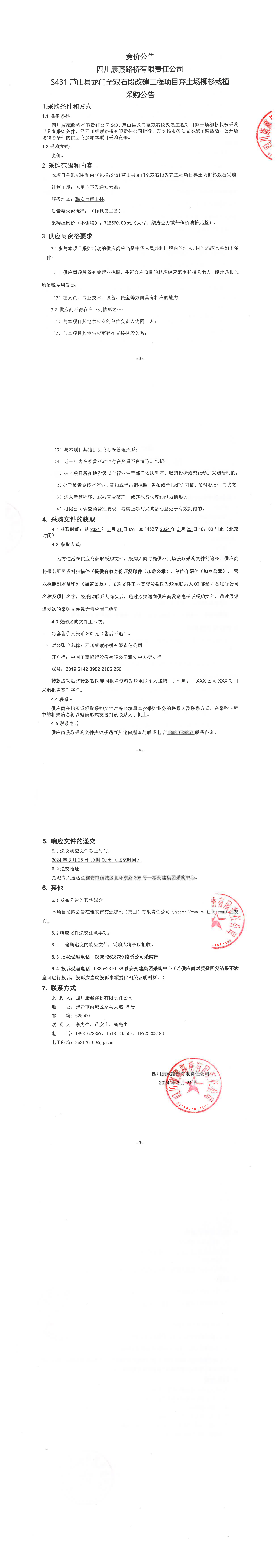 四川康藏路橋有限責(zé)任公司S431蘆山縣龍門(mén)至雙石段改建工程項(xiàng)目棄土場(chǎng)柳杉栽植采購(gòu)公告