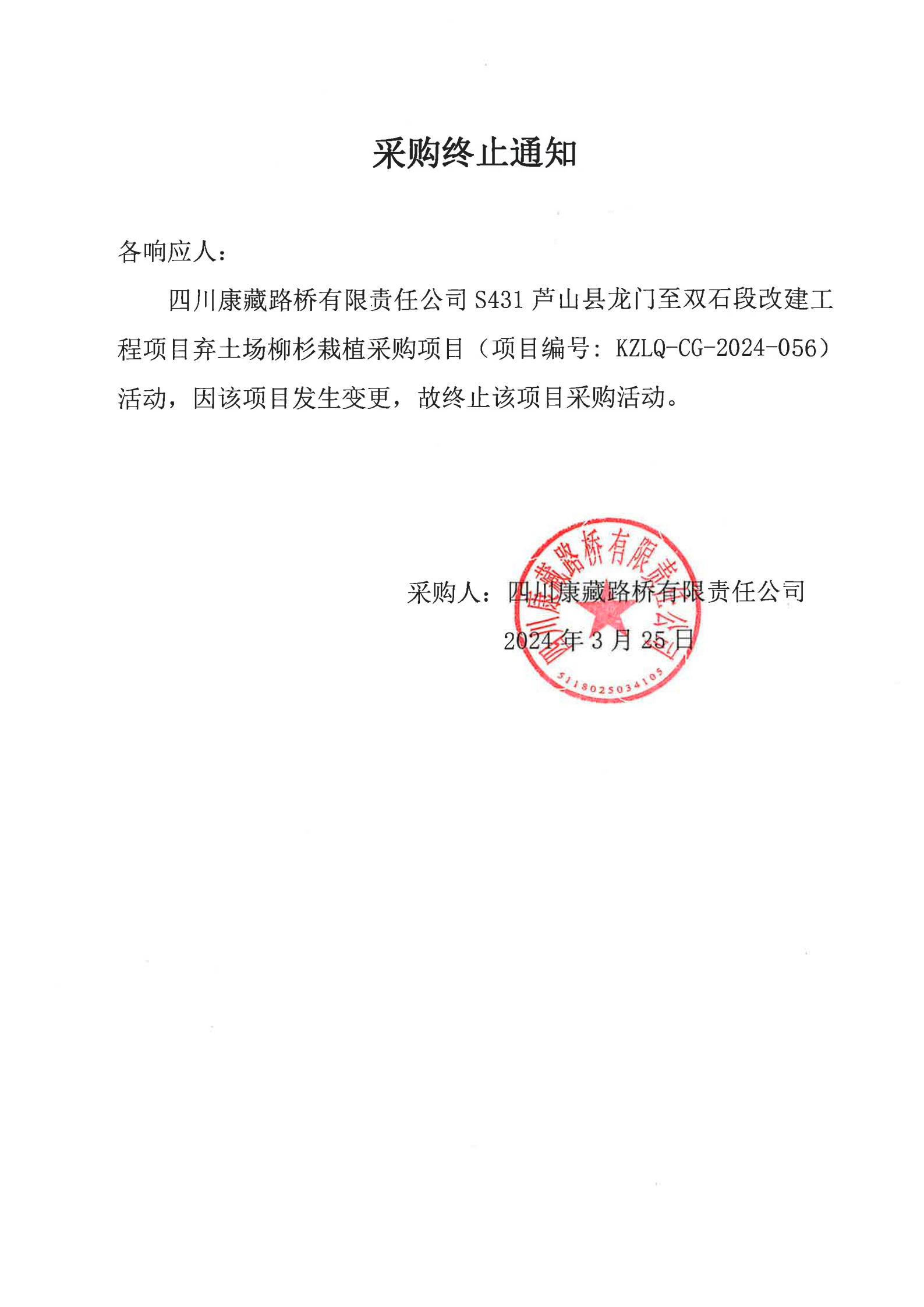四川康藏路橋有限責(zé)任公司S431蘆山縣龍門(mén)鎮(zhèn)至雙石段改建工程項(xiàng)目棄土場(chǎng)柳杉載植采購(gòu)終止通知