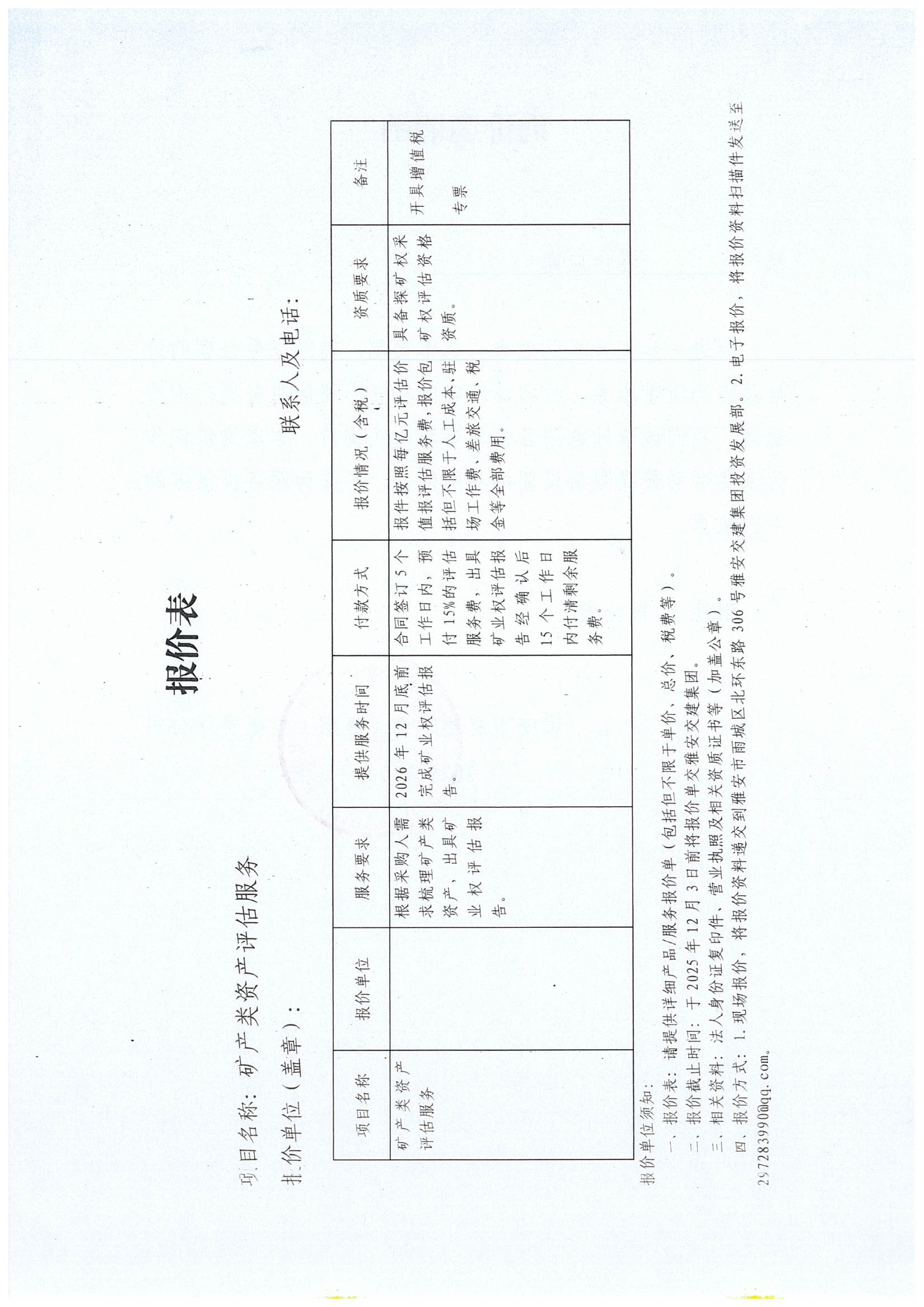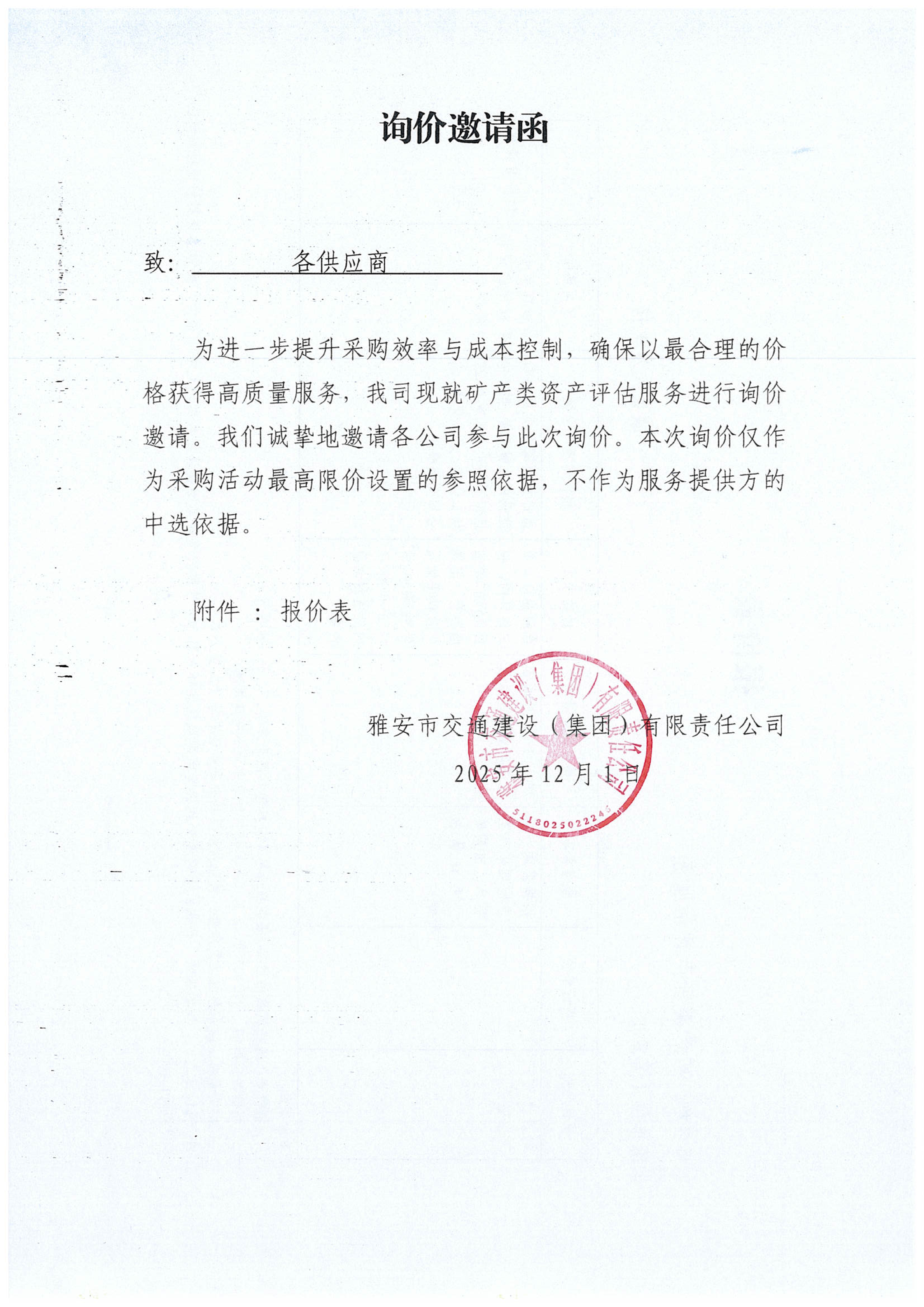 關(guān)于雅安市交通建設(shè)(集團(tuán))有限責(zé)任公司礦產(chǎn)類資產(chǎn)評(píng)估服務(wù)采購(gòu)限價(jià)的詢價(jià)函