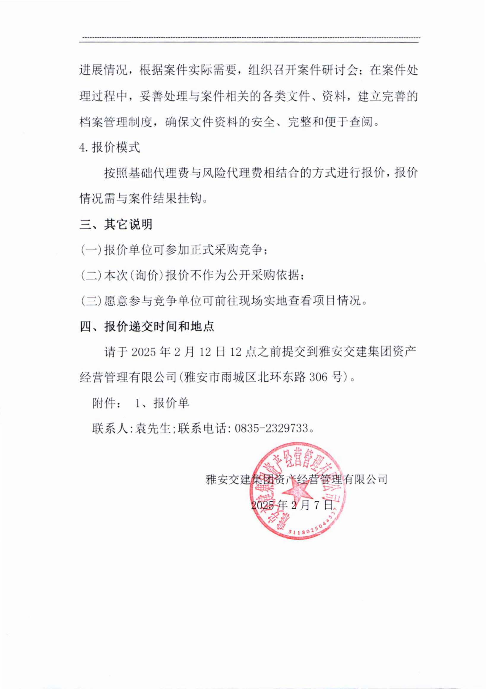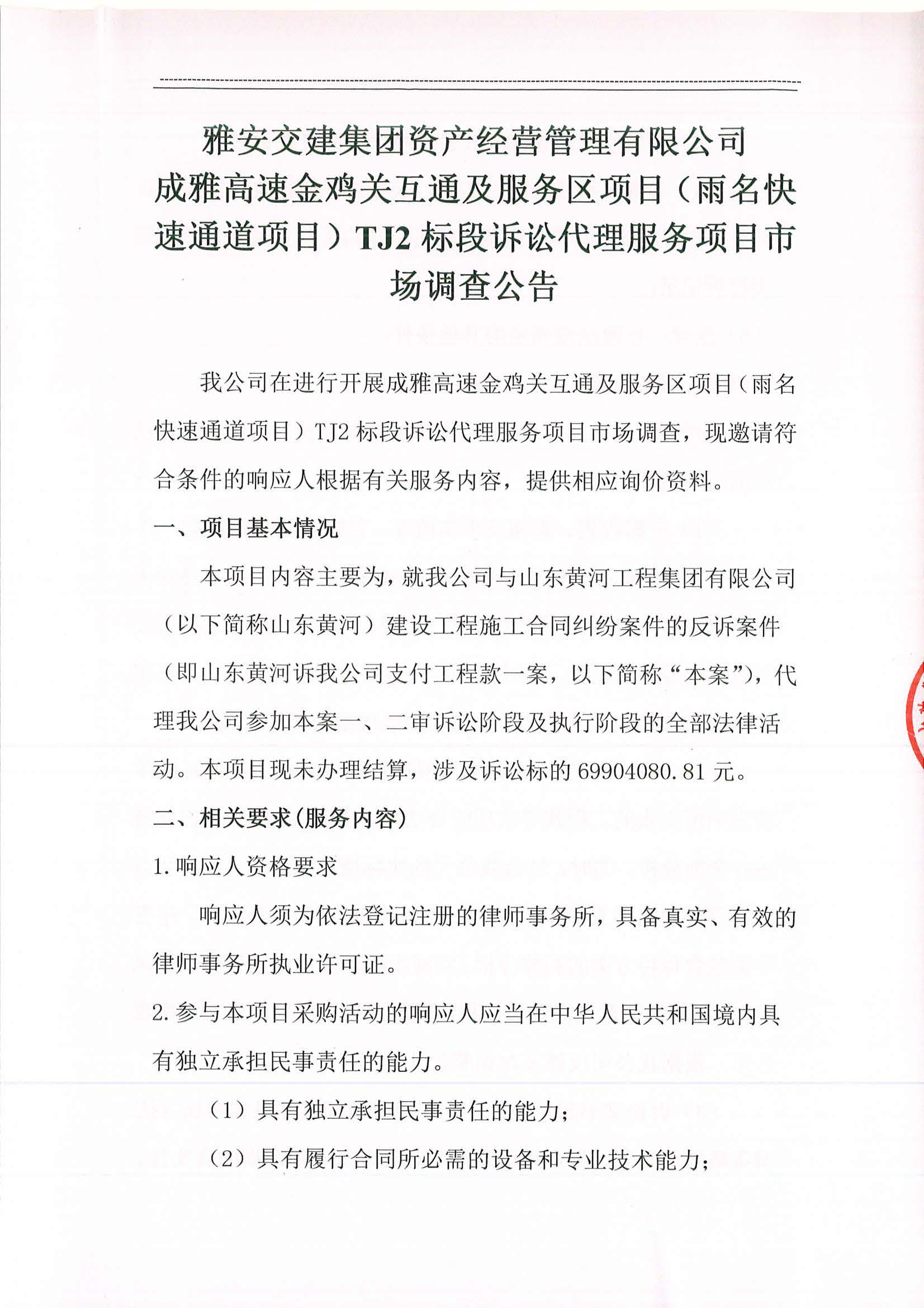 雅安交建集團資產(chǎn)經(jīng)營管理有限公司成雅高速金雞關(guān)互通及服務區(qū)項目(雨名快速通道項目)TJ2標段訴訟代理服務項目市場調(diào)查公告