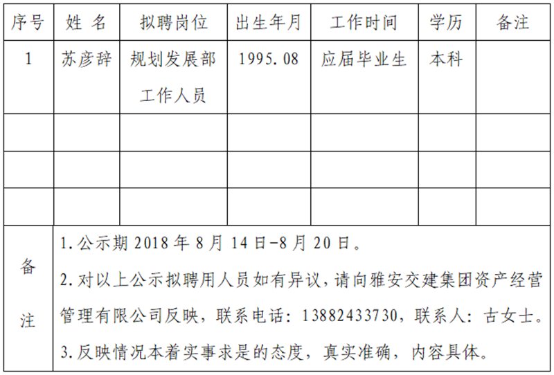 通過公開報名、資格審查、筆試、面試等程序,經雅安交建集團資產經營管理有限公司研究擇優(yōu)確定以下