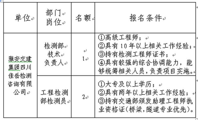 根據(jù)發(fā)展需要,決定面向社會(huì)公開(kāi)招聘雅安市交通建設(shè)(集團(tuán))有限責(zé)任公司(以下簡(jiǎn)稱“雅安交建集團(tuán)”)所屬子公司工作人員3名,現(xiàn)將有關(guān)事項(xiàng)公告如下:
