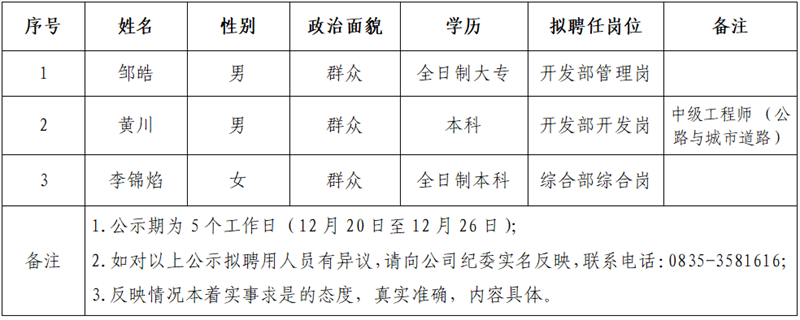 3名擬聘用人員予以公示:
