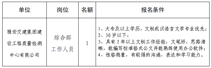 根據(jù)發(fā)展需要,決定面向社會公開招聘雅安市交通建設(shè)(集團)有限責(zé)任公司(以下簡稱“雅安交建集團”)所屬子公司工作人員1名,現(xiàn)將有關(guān)事項公告如下: