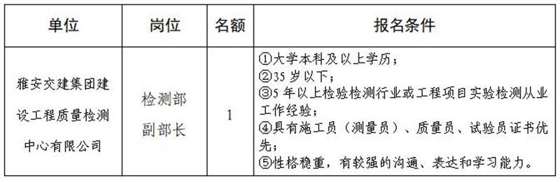 根據(jù)發(fā)展需要,決定面向社會(huì)公開招聘雅安市交通建設(shè)(集團(tuán))有限責(zé)任公司(以下簡稱“雅安交建集團(tuán)”)所屬子公司中層干部1名,現(xiàn)將有關(guān)事項(xiàng)公告如下:
