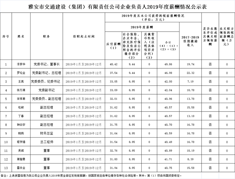 雅安市交通建設(shè)(集團)有限責任公司企業(yè)負責人2019年度薪酬情況公示表