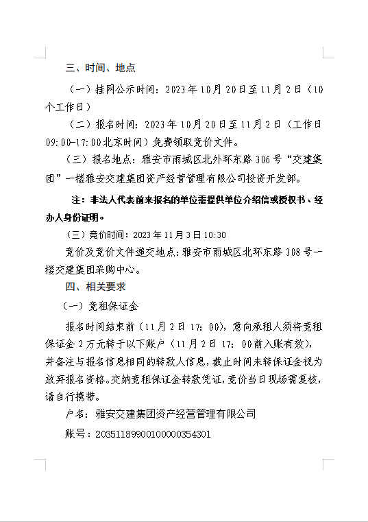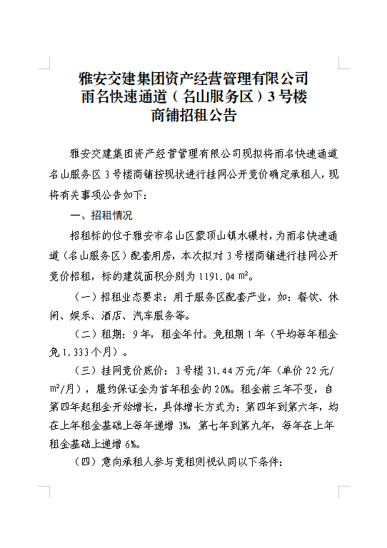 雅安交建集團資產(chǎn)經(jīng)營管理有限公司 雨名快速通道(名山服務區(qū))3號樓商鋪招租公告