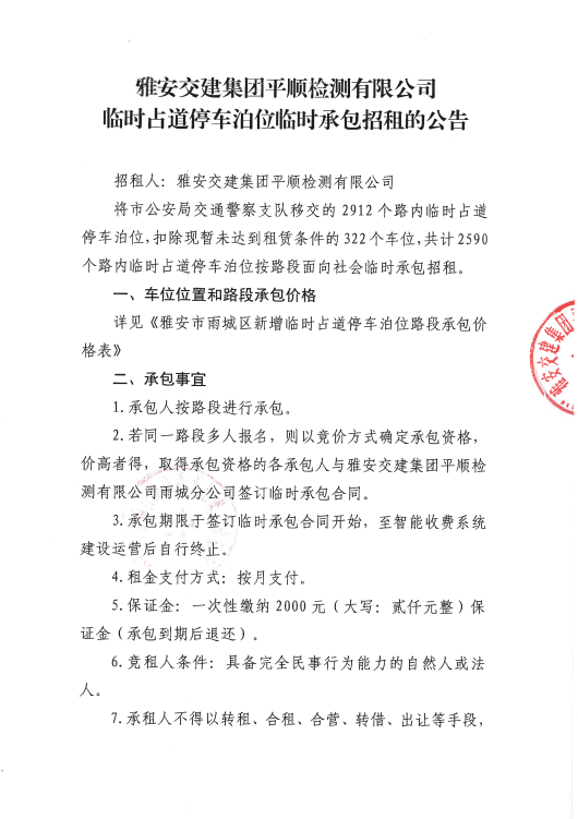 雅安交建集團(tuán)平順檢測(cè)有限公司臨時(shí)占道停車泊位臨時(shí)承包招租的公告