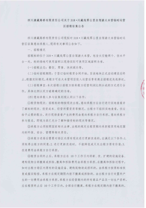 四川康藏路橋有限責任公司318·川藏線零公里自駕游大本營臨時用地臨時招租征集公告