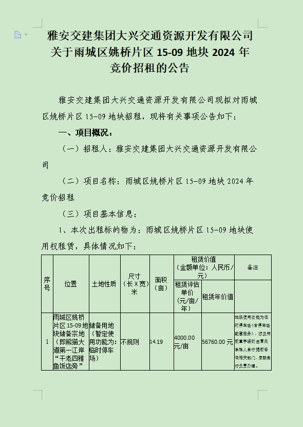 雅安交建集團(tuán)大興交通資源開發(fā)有限公司關(guān)于雨城區(qū)姚橋片區(qū)15-09地塊2024年競價(jià)招租的公告附件