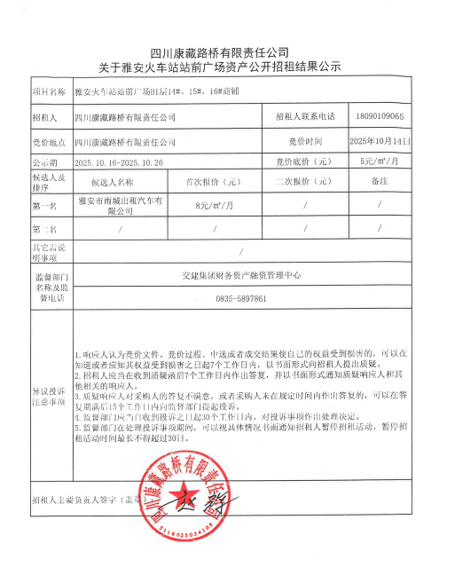 四川康藏路橋有限責(zé)任公司關(guān)于雅安火車站站前廣場資產(chǎn)公開招租結(jié)果公示