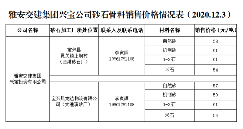ÑŰ²½»½¨¼¯ˆFÅdŒš¹«Ë¾É°Ê¯¹ÇÁÏäNÊÛƒr¸ñÇé›r±í£¨2020.12.3£©