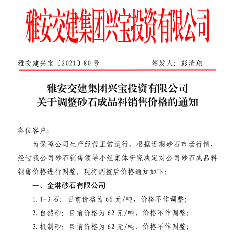 雅安交建集團(tuán)興寶公司關(guān)于調(diào)整成品料銷售價(jià)格的通知(2021.10.26)