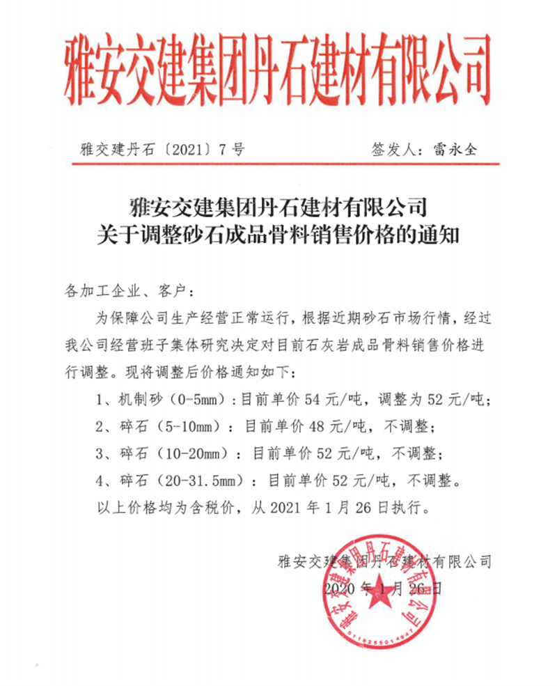 雅安交建集團(tuán)興寶公司砂石骨料銷售價(jià)格情況表(2021.1.14)