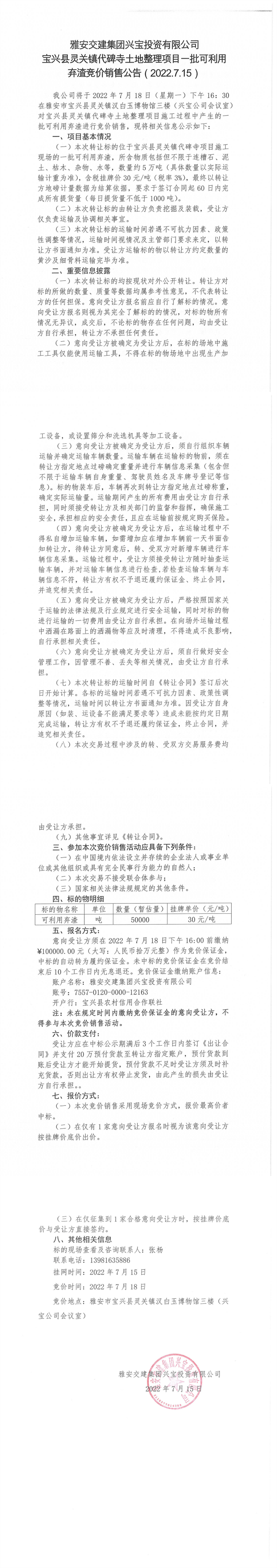 寶興縣靈關(guān)鎮(zhèn)代碑寺土地整理項目一批可利用棄渣競價銷售公告7.15(5萬噸)
