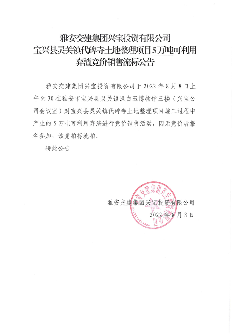 代碑寺土地整理項(xiàng)目5萬噸可利用棄渣競價銷售流標(biāo)公告