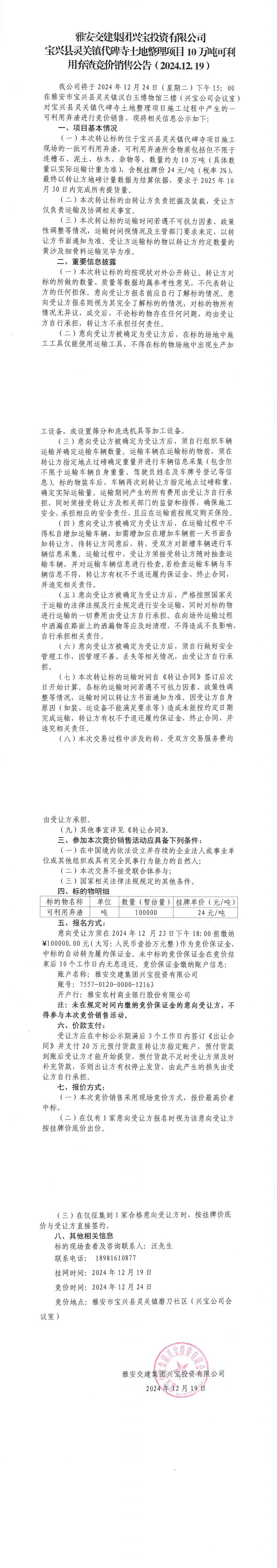 雅安交建集團(tuán)興寶投資有限公司靈關(guān)鎮(zhèn)代碑寺土地整理項(xiàng)目5萬(wàn)噸可利用棄渣競(jìng)價(jià)銷售公告(2024.12.19)