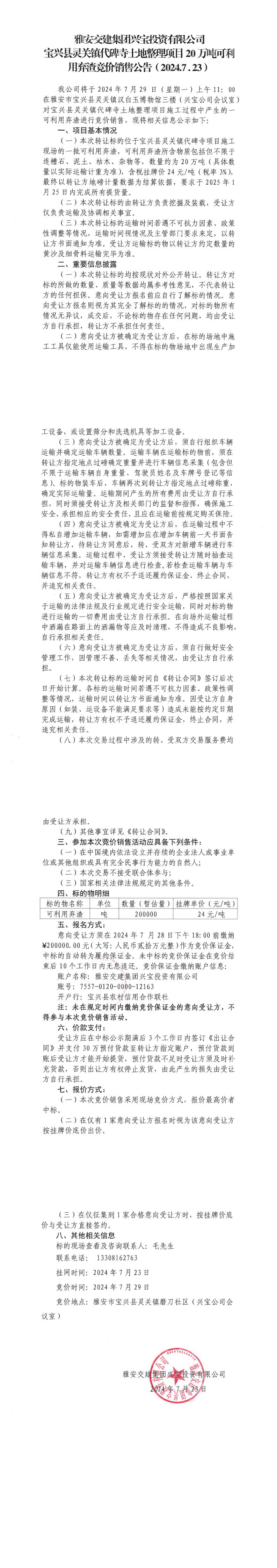 雅安交建集團(tuán)興寶投資有限公司靈關(guān)鎮(zhèn)代碑寺土地整理項目20萬噸可利用棄渣競價銷售公告(2024.7.23)