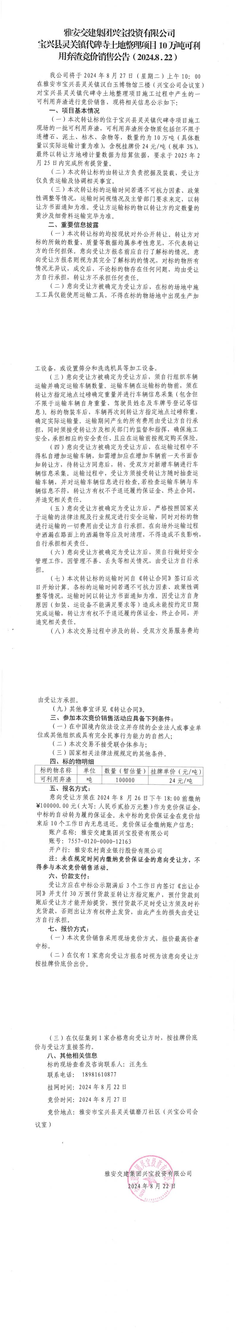 雅安交建集團(tuán)興寶投資有限公司寶興縣靈關(guān)鎮(zhèn)代碑寺土地整理項目10萬噸可利用棄渣競價銷售公告(2024-8-22)_0